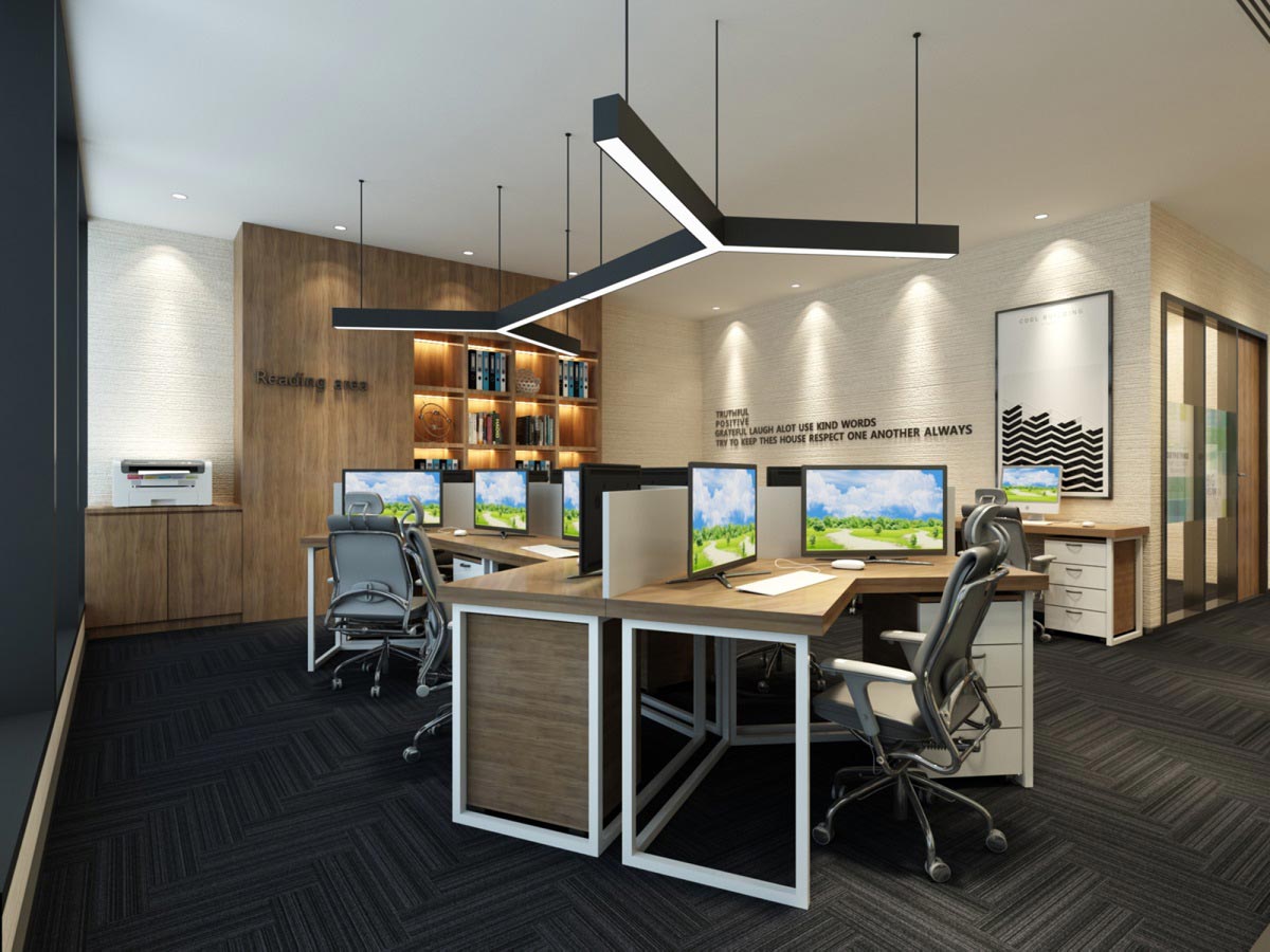 該公司的辦公室設計效果圖摒棄傳統的前臺,通過開放式的設計,讓前臺門面與接待融為一體,接待區用仿餐廳設計,加上燈光的點綴和中國風的掛畫,營造出文藝而又舒適的氛圍。其他辦公區域也同樣采用簡單的原木色家具,黃色與白色的搭配 整體色感趨于柔和,易于接近。